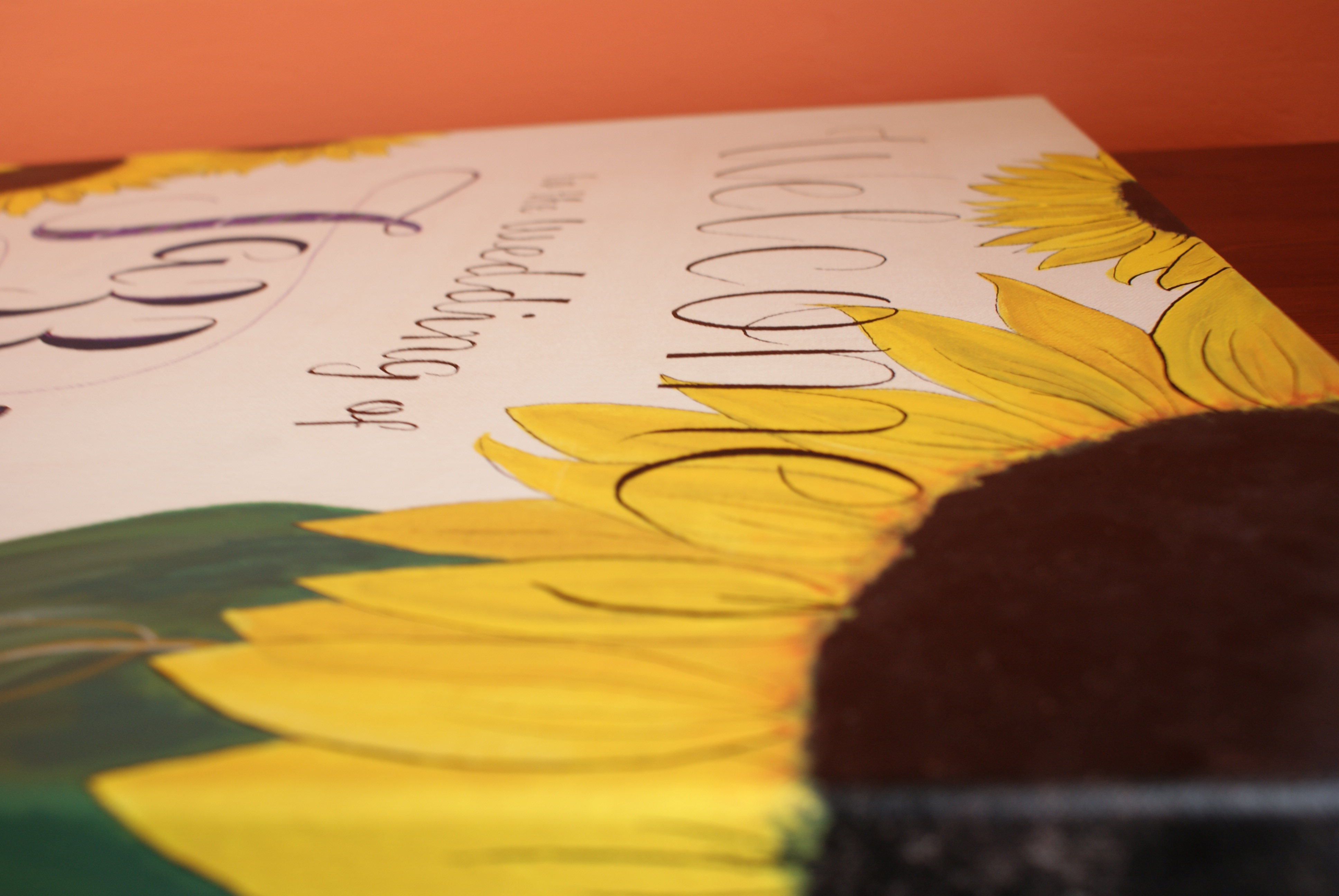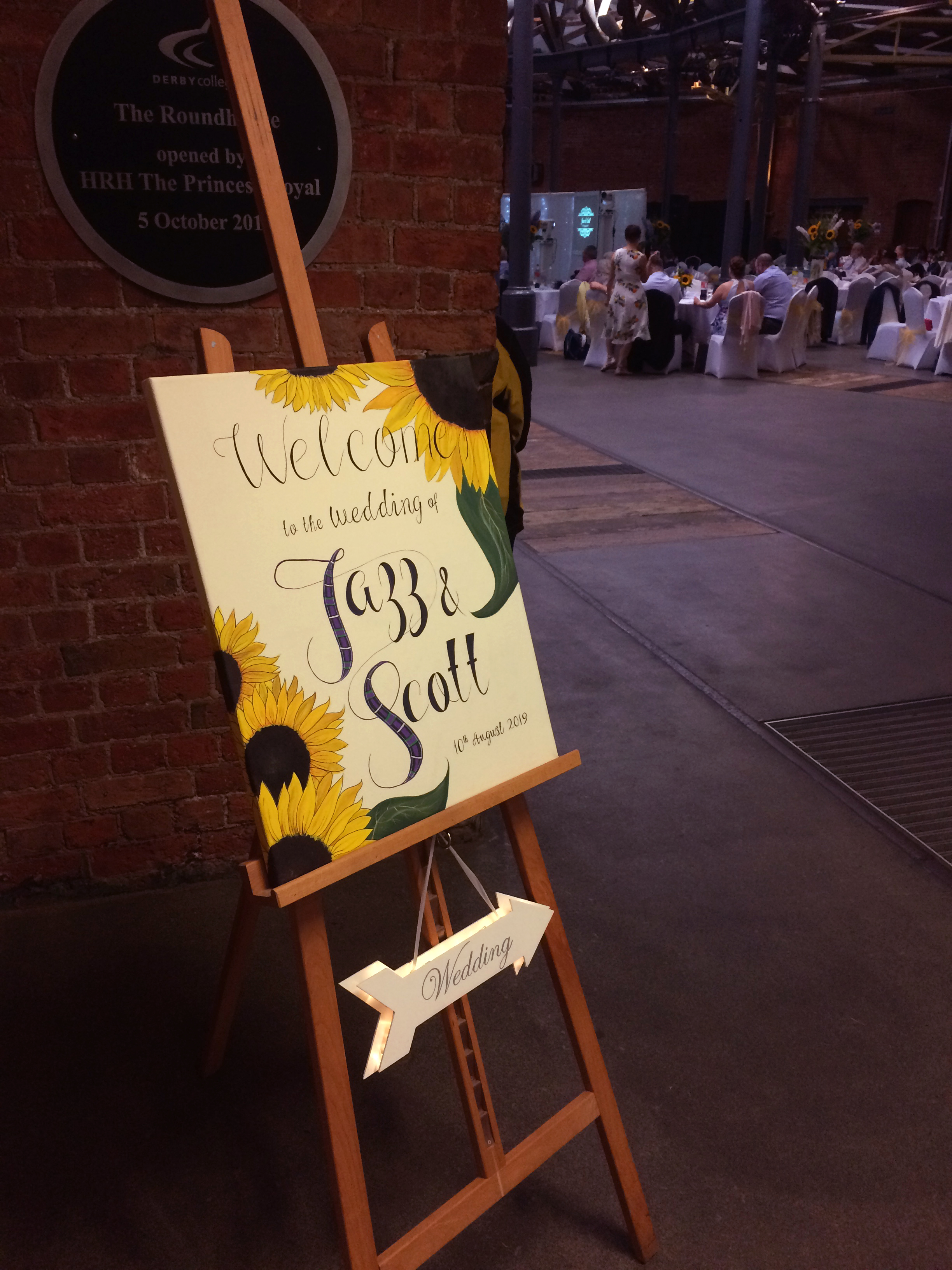 See left: A welcome sign for the wedding of Jazz and Scott. The day was a beautiful fusion of Indian and Scottish – combining sunflowers, tartan and many bright colours.
